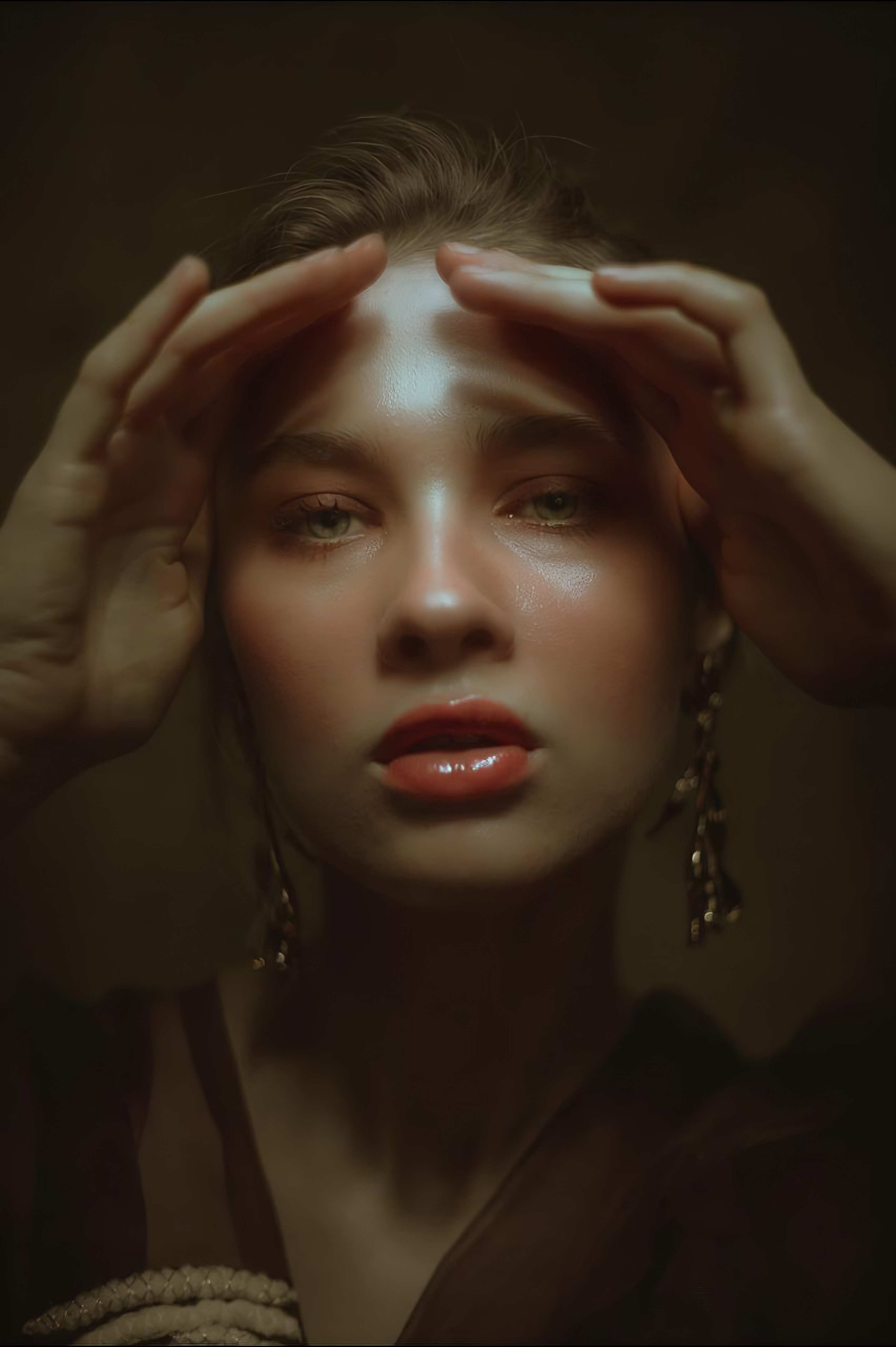 An expressive beauty editorial capturing soft light, natural textures, and intimate close framing to emphasize emotion, elegance, and contemporary fashion aesthetics.